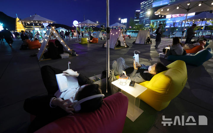 [서울=뉴시스] 홍효식 기자 = '세계 책과 저작권의 날'을 맞아 서울야외도서관 운영을 시작한 23일 오후 서울 종로구 광화문광장에 마련된 '광화문 책마당'에서 시민들이 독서를 즐기고 있다. 2025.04.23. [email protected]