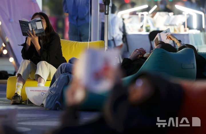 [서울=뉴시스] 홍효식 기자 = '세계 책과 저작권의 날'을 맞아 서울야외도서관 운영을 시작한 23일 오후 서울 종로구 광화문광장에 마련된 '광화문 책마당'에서 시민들이 독서를 즐기고 있다. 2025.04.23. [email protected]