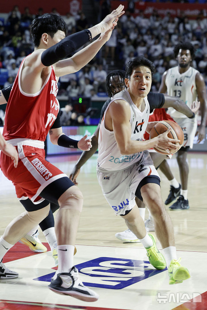 [서울=뉴시스] 최동준 기자 = 23일 서울 송파구 잠실학생체육관에서 열린 2024-2025 KBL 4강 플레이오프 수원 KT 소닉붐과 서울 SK 나이츠의 경기, KT 허훈이 돌파하고 있다. 2025.04.23. [email protected]
