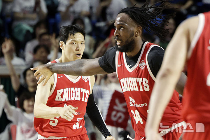 [서울=뉴시스] 최동준 기자 = 23일 서울 송파구 잠실학생체육관에서 열린 2024-2025 KBL 4강 플레이오프 수원 KT 소닉붐과 서울 SK 나이츠의 경기, SK 김선형이 3점슛을 성공시킨 뒤 자밀 워니와 하이파이브하고 있다. 2025.04.23. [email protected]