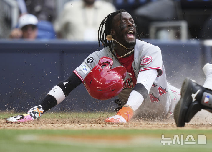 [마이애미=AP/뉴시스] 신시내티 레즈의 엘리 데 라 크루즈가 23일(현지 시간) 미 플로리다주 마이애미의 론디포 파크에서 열린 2025 메이저리그 마이애미 말린스와의 경기 8회 초 홈으로 쇄도하며 득점하고 있다. 신시내티가 5-2로 승리했다. 2025.04.24.
