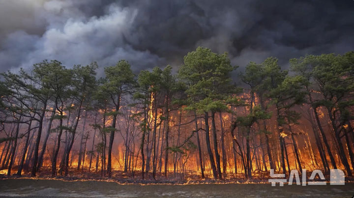[레이시타운십=AP/뉴시스] 지난 22일(현지 시간) 미 뉴저지주 오션카운티 존스 로드에서 발생한 '존스 로드 산불'로 레이시타운십의 나무들이 불길에 휩싸이고 있다. 현지 당국은 이 산불로 산림 수천 에이커가 타고 수백 채의 건물이 화재 위험에 처했으며 인근 주민 3000명이 대피했다. 2025.04.24.
