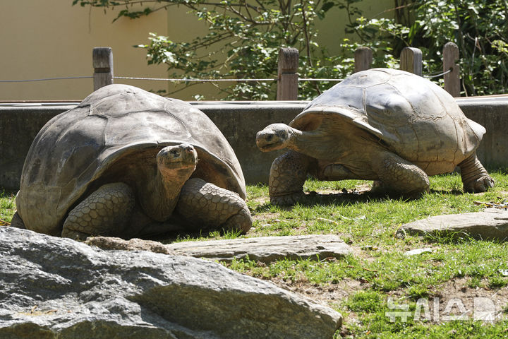 [필라델피아=AP/뉴시스] 23일(현지 시간) 미 펜실베이니아주 필라델피아 동물원에서 약 100살 된 갈라파고스 거북 ‘마미’(오른쪽)와 약 96살인 '아브라조'가 우리를 거닐고 있다. 마미는 지난 2월 처음으로 새끼 네 마리를 부화시켜 동물원 150년 역사상 최초의 갈라파고스 거북 부화 사례를 기록했으며, 최고령 초산으로도 이름을 올렸다. 2025.04.24.