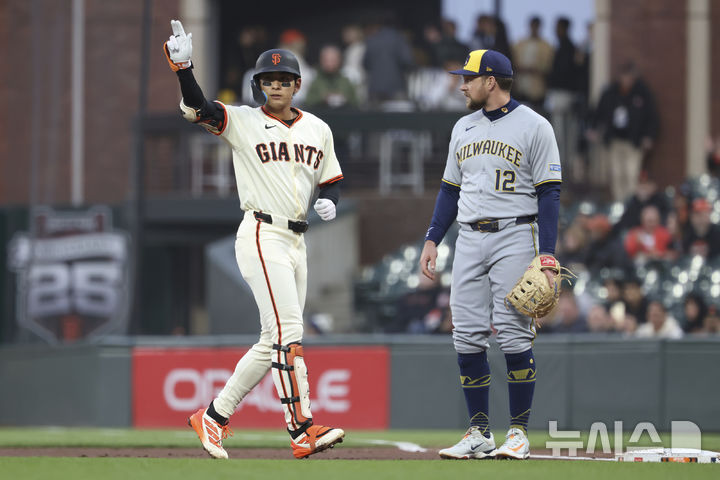 [샌프란시스코=AP/뉴시스] 샌프란시스코 자이언츠의 이정후(왼쪽)가 23일(현지 시간) 미 캘리포니아주 샌프란시스코 오라클 파크에서 열린 2025 메이저리그 밀워키 브루어스와의 경기 1회 말 좌전 안타를 치고 나가 세리머니하고 있다. 2025.04.24.