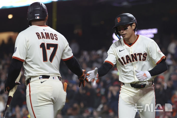 [샌프란시스코=AP/뉴시스] 샌프란시스코 자이언츠의 이정후(오른쪽)가 23일(현지 시간) 미 캘리포니아주 샌프란시스코 오라클 파크에서 열린 2025 메이저리그 밀워키 브루어스와의 경기 6회 말 득점 후 엘리엇 라모스와 세리머니하고 있다. 2025.04.24.