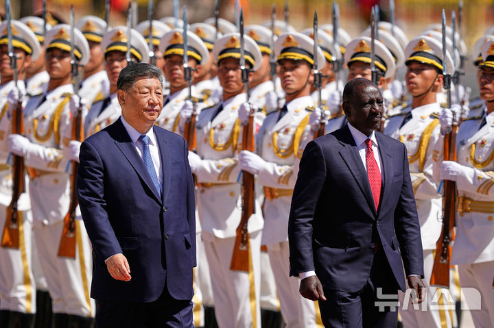 [베이징=AP/뉴시스] 시진핑(왼쪽) 중국 국가주석과 윌리엄 루토 케냐 대통령이 24일(현지 시간) 중국 베이징 인민대회당에서 열린 공식 환영식에 참석해 의장대를 사열하고 있다. 루토 대통령은 시 주석의 초청으로 중국을 국빈 방문했다. 2025.04.24.