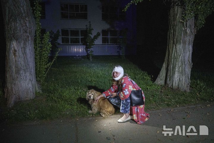 [키이우=AP/뉴시스] 24일(현지 시간) 우크라이나 키이우의 주택가에서 한 부상 여성이 반려견과 함께 러시아의 공습으로 파괴된 집 근처에 앉아 있다. 현지 당국은 드론과 미사일을 동원한 러시아의 공격으로 지금까지 최소 9명이 숨지고 어린이 포함 70명 이상이 다쳤다고 밝혔다. 2025.04.24.