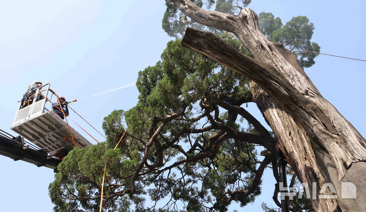 서초역의 약 900년 된 보호수 '천년향'은 서초구가 아시아·태평양 사법정의 허브로 성장하는 데 상징적 역할을 하며, 구는 이 지역을 세계적 사법정의 중심지로 키우기 위한 다양한 활동과 함께 향나무 후계목을 심어 가치를 계승하고 있다. (공동취재) 2025.04.24. [email protected]