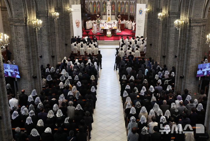 [서울=뉴시스] 이영환 기자 = 24일 오전 서울 중구 명동대성당에서 천주교 서울대교구장 정순택 대주교 주례로 프란치스코 교황 추모 미사가 거행되고 있다. 2025.04.24. [email protected]