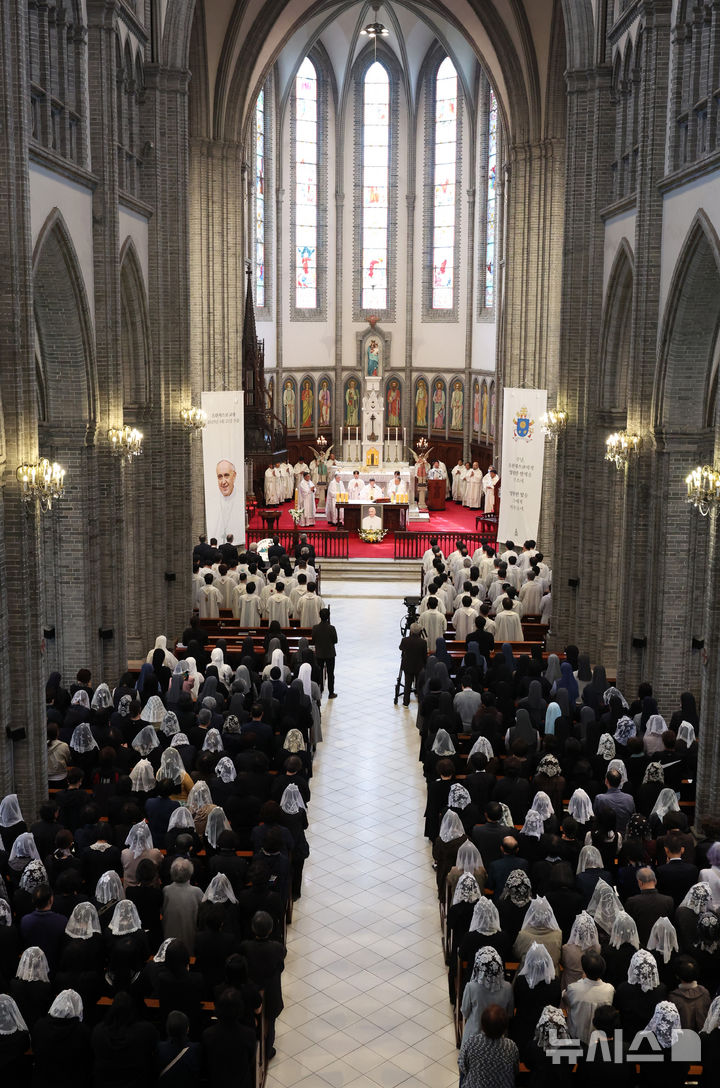 [서울=뉴시스] 이영환 기자 = 24일 오전 서울 중구 명동대성당에서 천주교 서울대교구장 정순택 대주교 주례로 프란치스코 교황 추모 미사가 거행되고 있다. 2025.04.24. [email protected]