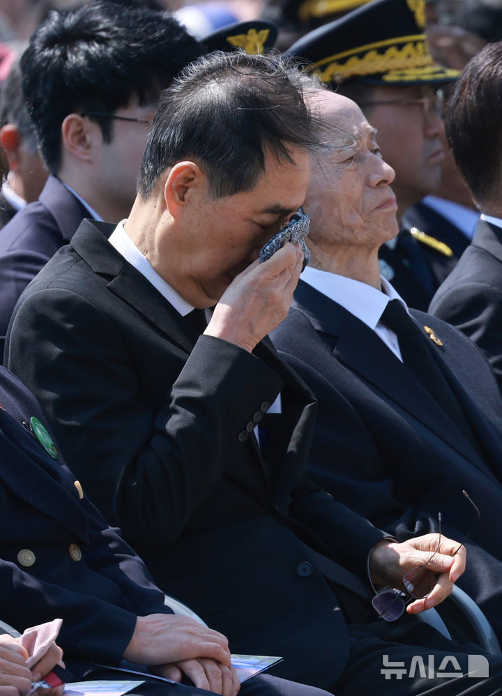 [대전=뉴시스] 고범준 기자 = 한덕수 대통령 권한대행 국무총리가 25일 대전 유성구 국립대전현충원에서 열린 제2회 순직의무군경의 날 기념식에서 눈물을 닦고 있다. (대통령실통신사진기자단) 2025.04.25. [email protected]