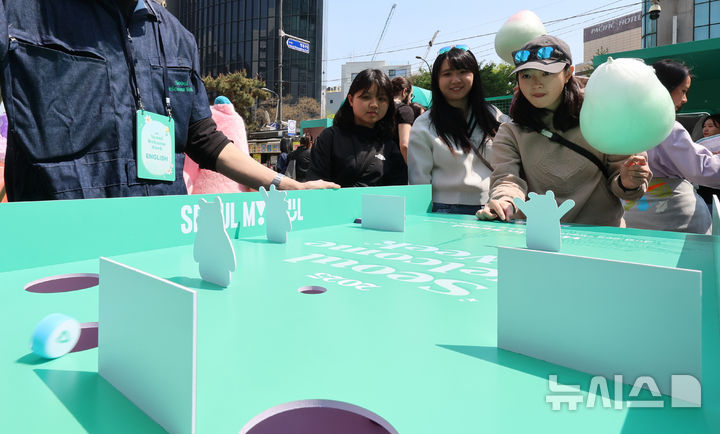 [서울=뉴시스] 김금보 기자 = 25일 오후 서울 중구 명동 밀리오레 앞에 마련된 '2025 서울환대주간, 서울여행정류소'에서 외국인 관광객들이 '서울 궁궐 통합관람권'이 걸린 미니 게임을 하고 있다.