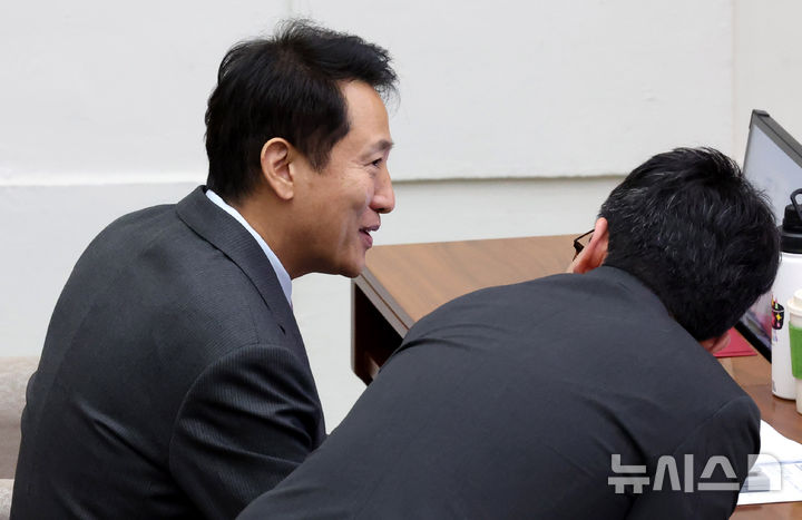 [서울=뉴시스] 추상철 기자 = 오세훈 서울시장이 25일 오후 서울 중구 서울시의회에서 열린 제330회 시의회 임시회 2차 본회의에서 김병민 서울시 정무부시장과 대화하고 있다. 2025.04.25. [email protected]