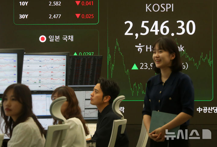 [서울=뉴시스] 김혜진 기자 = 코스피가 전 거래일(2522.33)보다 23.97포인트(0.95%) 상승한 2546.30에 장을 마감한 25일 오후 서울 중구 하나은행 딜링룸 전광판에 지수가 표시 되고 있다.
