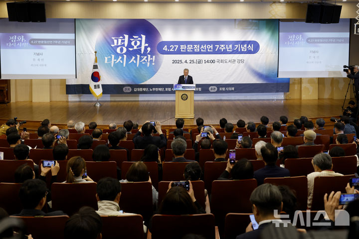[서울=뉴시스] 권창회 기자= 문재인 전 대통령이 25일 국회도서관에서 열린 4.27판문점선언 7주년 기념식에서 기념사를 하고 있다. (공동취재) 2025.04.25. [email protected]