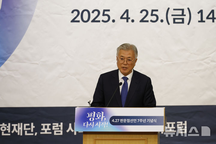 [서울=뉴시스] 권창회 기자= 문재인 전 대통령이 25일 국회도서관에서 열린 4.27판문점선언 7주년 기념식에서 기념사를 하고 있다.(공동취재) 2025.04.25. [email protected]