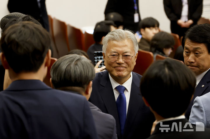 [서울=뉴시스] 권창회 기자= 문재인 전 대통령이 25일 국회도서관에서 열린 4.27판문점선언 7주년 기념식을 마치고 참석자들과 인사를 나누고 있다.(공동취재) 2025.04.25. [email protected]