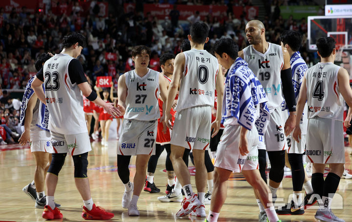 [서울=뉴시스] 김선웅 기자 = 25일 서울 송파구 잠실학생체육관에서 열린 2024-2025 프로농구 4강 플레이오프 서울 SK 나이츠 vs 수원 KT 소닉붐의 경기, 70-86으로 패배한 KT 선수들이 아쉬워하며 서로를 위로하고 있다. 2025.04.25. [email protected]