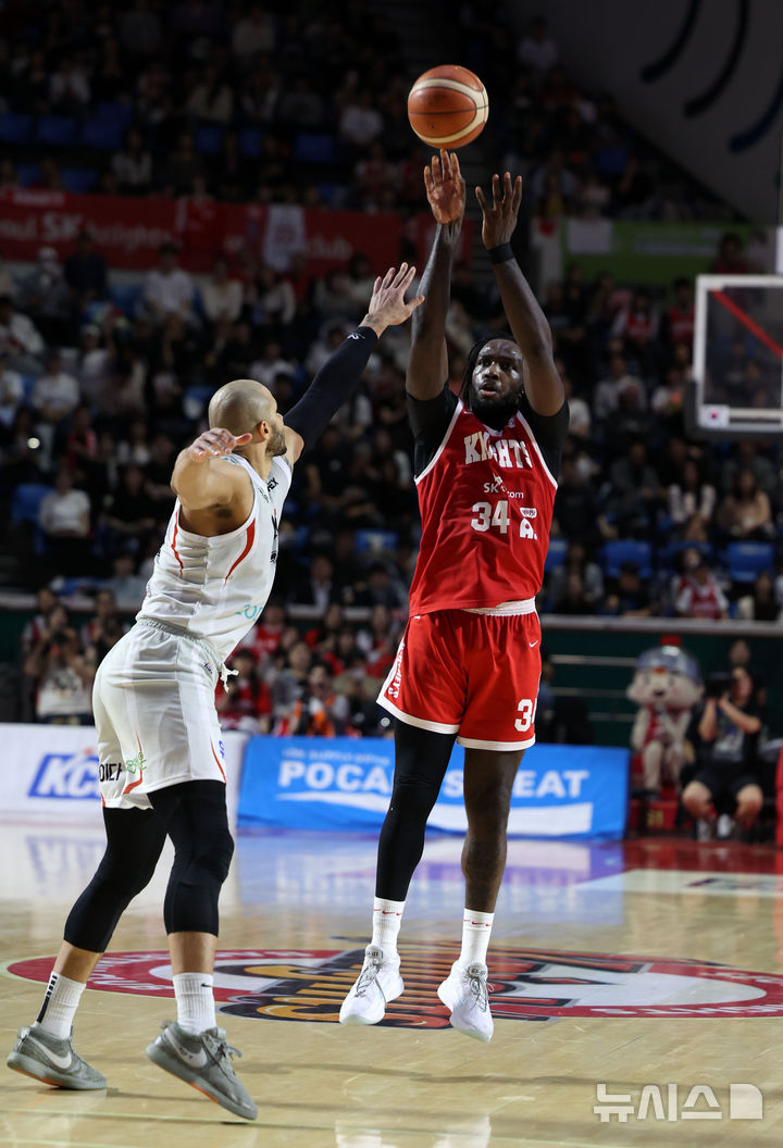[서울=뉴시스] 김선웅 기자 = 25일 서울 송파구 잠실학생체육관에서 열린 2024-2025 프로농구 4강 플레이오프 서울 SK 나이츠 vs 수원 KT 소닉붐의 경기, SK 자밀 워니가 슛을 하고 있다. 2025.04.25. [email protected]