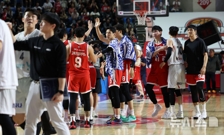 [서울=뉴시스] 김선웅 기자 = 25일 서울 송파구 잠실학생체육관에서 열린 2024-2025 프로농구 4강 플레이오프 서울 SK 나이츠 vs 수원 KT 소닉붐의 경기, 86-70으로 승리를 거둔 SK 선수들이 기뻐하고 있다. 2025.04.25. [email protected]