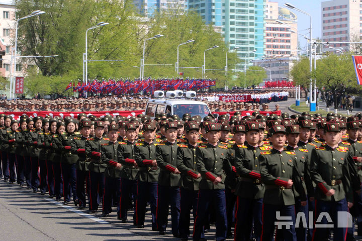 [평양=AP/뉴시스] 25일 조선인민혁명군(항일유격대·빨치산) 창건 93주년을 맞아 북한 평양에서 북한 인민군이 항일 혁명 선열의 넋을 기리며 행진하고 있다. 북한은 인민군의 뿌리로 여기는 조선인민혁명군을 위대한 김정은 혁명강군으로 강화·발전시켜야 한다며 김정은 국무위원장에 대한 충성을 촉구했다. 2025.04.26.