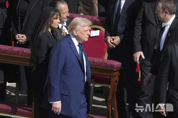 [바티칸=AP/뉴시스] 도널드 트럼프 미국 대통령과 아내 멜라니아 여사가 26일(현지 시간) 바티칸 성 베드로 광장에서 열리는 프란치스코 교황 장례식에 참석하고 있다. 2025.04.26.