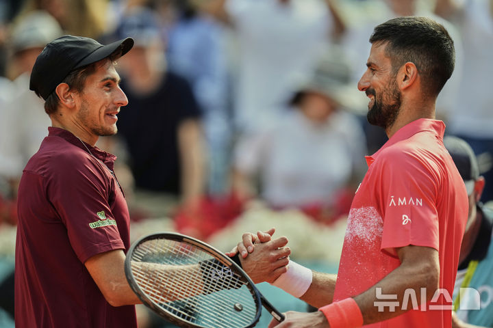 [마드리드=AP/뉴시스] 노바크 조코비치(5위·세르비아, 오른쪽)가 26일(현지 시간) 스페인 마드리드에서 열린 남자프로테니스(ATP) 투어 마드리드 오픈 단식 2라운드에서 마테오 아르날디(44위·이탈리아)에게 패한 후 악수하고 있다. 조코비치는 그의 첫 경기에서 0-2(3-6 4-6)로 패해 탈락했다. 2025.04.27.