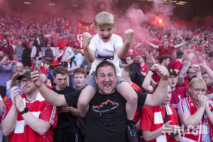 [리버풀=AP/뉴시스] 리버풀 팬들이 27일(현지 시간) 영국 리버풀의 안필드에서 열린 2024-25 프리미어리그 34라운드 토트넘 홋스퍼와의 경기에서 승리해 리그 우승을 확정한 후 환호하고 있다. 리버풀은 손흥민이 부상으로 빠진 토트넘에 5-1로 승리하고 남은 경기 결과에 상관없이 우승을 확정했다. 2025.04.28.
