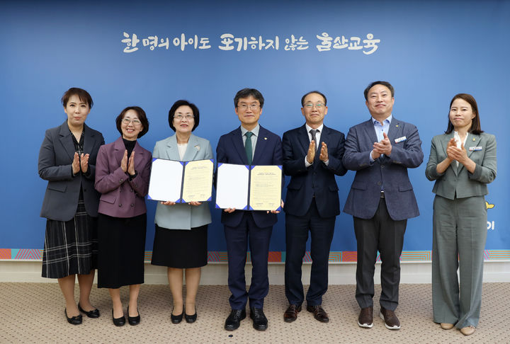 [울산=뉴시스] 구미현 기자 = 천창수 울산교육감과 김희진 춘해보건대 총장 등 양 기관 관계자들이 28일 울산시교육청 접견실에서 현장체험학습 안전보조인력 지원을 내용으로 하는 업무협약을 체결한 뒤 기념촬영하고 있다. 이번 협약으로 춘해보건대는 1학년 학생을 제외하고 심폐소생술 과정을 이수한 1500명의 학생을 대상으로 현장체험학습 인력망을 구성할 예정이다. (사진=울산시교육청 제공) 2025.04.28. [email protected]