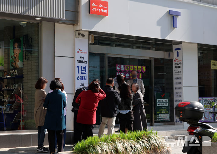 [서울=뉴시스] 이영환 기자 = SK텔레콤이 사이버 침해 피해를 막기 위해 전국 2600여곳의 T월드 매장에서 희망 고객들을 대상으로 유심 무상 교체를 진행하는 28일 오전 서울 시내의 한 T월드 매장에서 시민들이 매장 오픈을 기다리고 있다. 2025.04.28. [email protected]