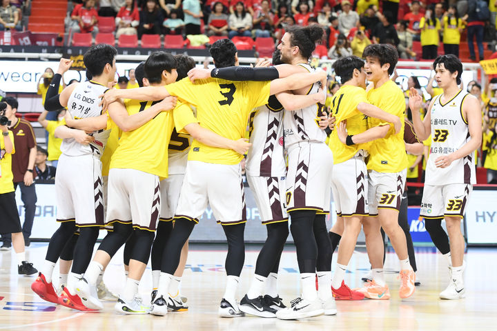 [서울=뉴시스] 28일 울산 동천체육관에서 열린 2024-2025 KCC 프로농구 4강 플레이오프 울산 현대모비스와 창원 LG의 3차전에서 76-74로 승리한 LG 선수들이 기뻐하고 있다.(사진=KBL 제공) 2025.04.28. [email protected] *재판매 및 DB 금지