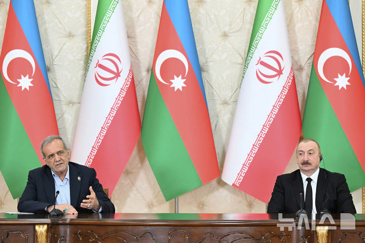 [바쿠=AP/뉴시스] 일함 알리예프(오른쪽) 아제르바이잔 대통령과 마수드 페제시키안 이란 대통령이 28일(현지 시간) 아제르바이잔 바쿠에서 회담 후 공동 기자회견하고 있다. 2025.04.29.