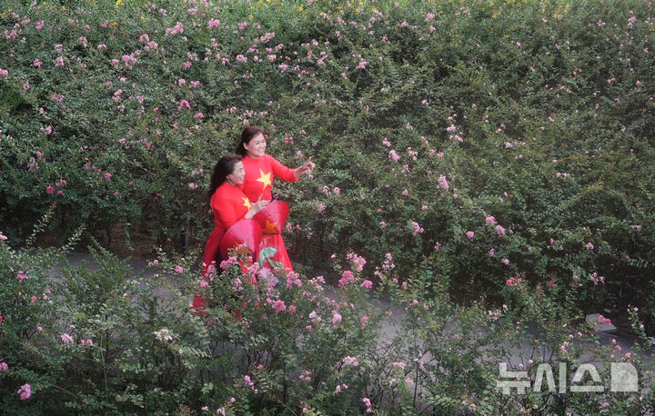 [호찌민=AP/뉴시스] 29일(현지 시간) 베트남 호찌민의 한 공원에서 베트남 국기로 장식된 전통 의상 '아오자이'를 입은 여성들이 걷고 있다. 베트남은 오는 30일 베트남 전쟁(1955∼1975) 종전 및 통일 50주년을 맞는다. 2025.04.29.