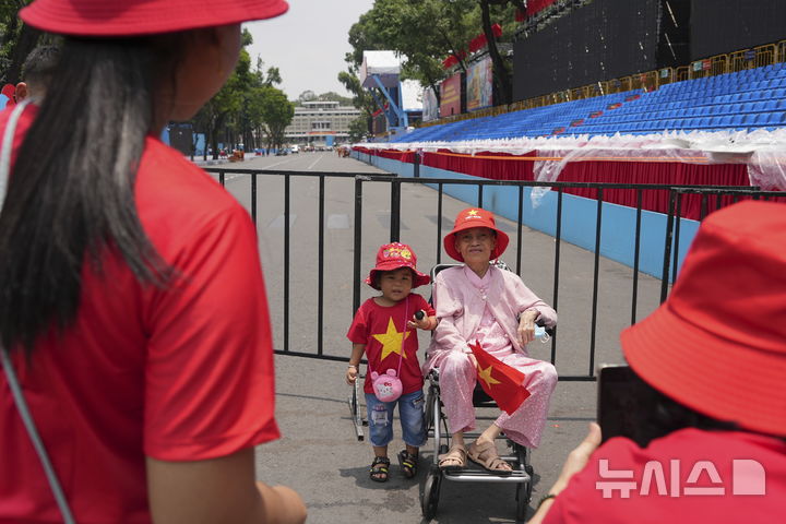 [호찌민=AP/뉴시스] 29일(현지 시간) 베트남 호찌민에서 한 여성이 손주와 함께 전쟁 종전 50주년 기념 퍼레이드가 열릴 행사장 인근에서 기념사진을 찍고 있다. 해당 퍼레이드는 30일에 열릴 예정이다. 2025.04.29.