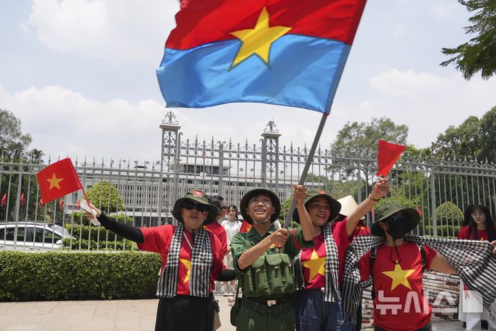 [호찌민=AP/뉴시스] 29일(현지 시간) 베트남 호찌민의 독립궁(통일궁) 앞에서 시민들이 전쟁 종전 50주년을 기념해 베트남 국기와 옛 남베트남민족해방전선(NLF) 깃발을 흔들고 있다. 베트남은 오는 30일 베트남 전쟁(1955∼1975) 종전 및 통일 50주년을 맞는다. 2025.04.29.