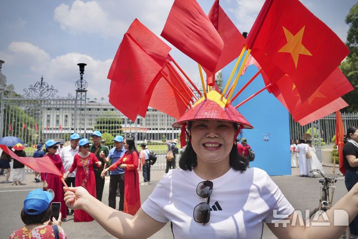[호찌민=AP/뉴시스] 29일(현지 시간) 베트남 호찌민의 독립궁(통일궁) 앞에서 한 여성이 베트남 국기로 장식된 전통 모자를 쓰고 국기를 흔들며 베트남 전쟁 종전 50주년을 기념하고 있다. 베트남은 오는 30일 베트남 전쟁(1955∼1975) 종전 및 통일 50주년을 맞는다. 2025.04.29.