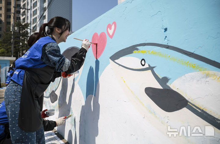[서울=뉴시스] 정병혁 기자 = 복권위원회 홍보대사인 배우 박하선이 29일 서울 은평구 꿈나무마을 파란꿈터에서 열린 복권위원회 행복공감봉사단, 취약 아동 및 청소년 위한 새봄맞이 환경 개선 봉사활동에서 수영장 벽화를 칠하고 있다. 2025.04.29. [email protected]
