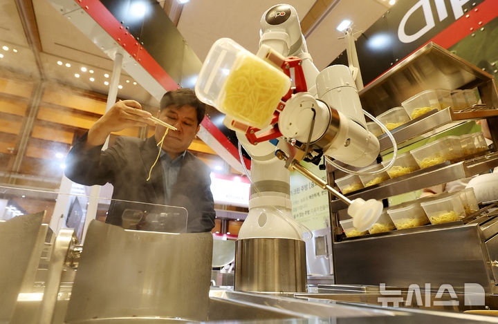 [서울=뉴시스] 추상철 기자 = 29일 오전 서울 강남구 코엑스에서 열린 '2025 우수급식외식산업전'에서 참가업체 관계자가 로봇팔을 활용한 조리 시연 및 시식행사를 하고 있다. 2025.04.29. [email protected]