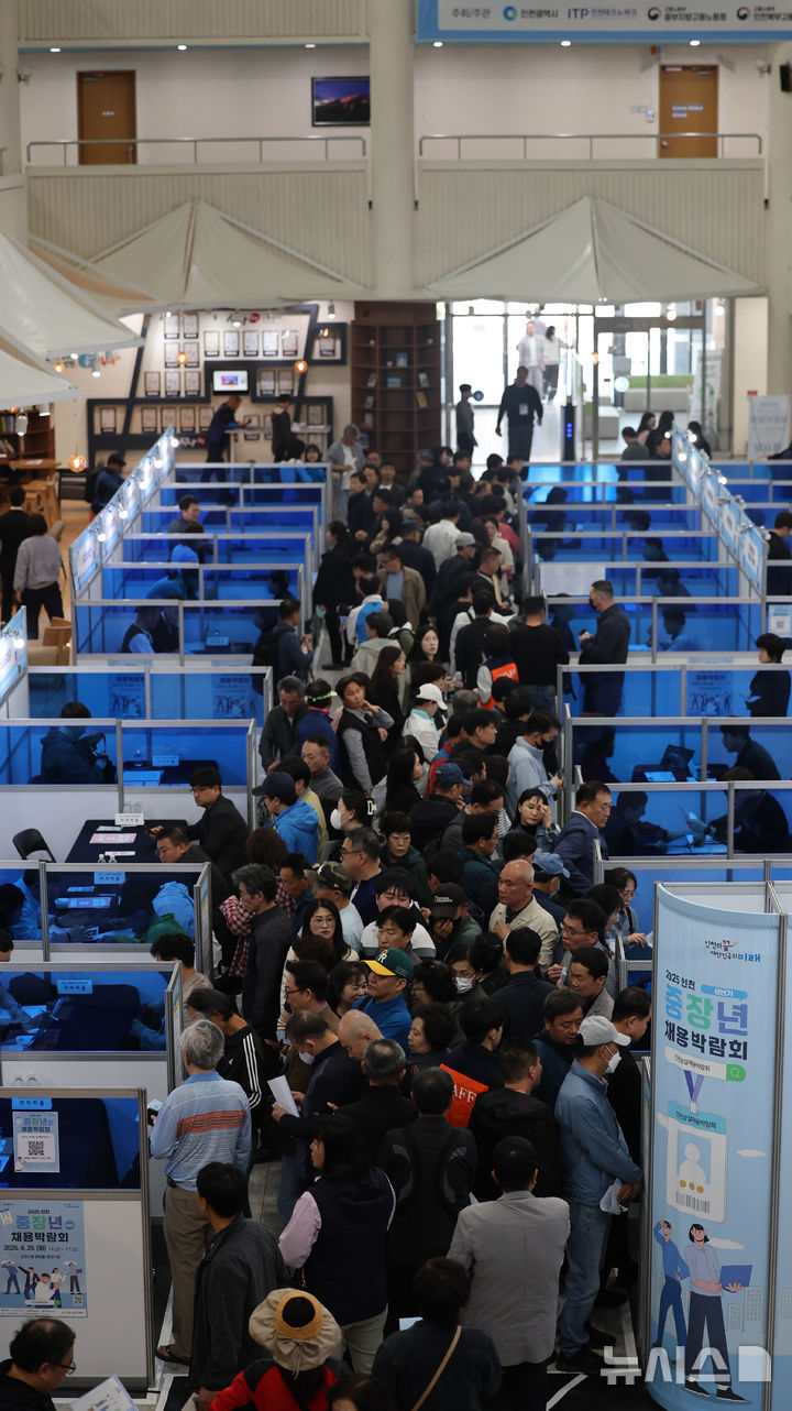 [인천=뉴시스] 전진환 기자 = 2025 인천 중장년 채용박람회가 열린 29일 오후 인천 남동구 인천시청 로비에서 구직자들이 이력서를 작성하고 있다. 2025.04.29. [email protected]