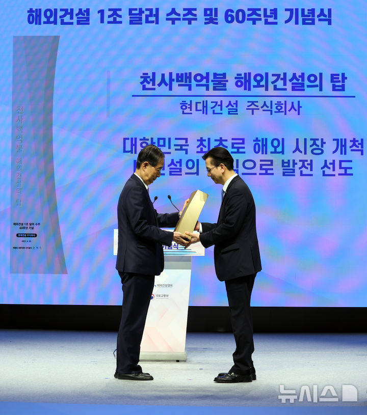 [서울=뉴시스] 최진석 기자 = 한덕수 대통령 권한대행 국무총리가 29일 서울 강남구 건설회관에서 열린 해외건설 1조달러 수주 및 60주년 기념식에서 이한우 현대건설 대표이사에게 해외건설의 탑을 수여하고 있다. 2025.04.29. [email protected]