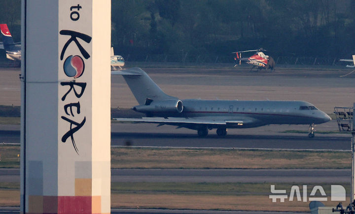 [서울=뉴시스] 김명년 기자 = 도널드 트럼프 미국 대통령의 장남 트럼프 주니어가 탑승한 항공기가 29일 서울 강서구 김포공항에 착륙하고 있다. 정용진 신세계그룹 회장의 초청으로 한국을 찾는 트럼프 주니어는 국내 주요 대기업 총수와 개별 면담을 가질 예정이다.(공동취재) 2025.04.29. [email protected]