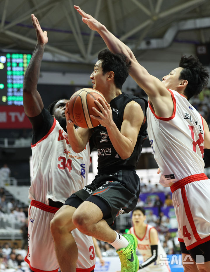 [수원=뉴시스] 황준선 기자 = 29일 오후 경기 수원시 권선구 KT소닉붐아레나에서 열린 2024~2025 프로농구 4강 플레이오프 수원KT와 서울SK의 4차전, KT 허훈이 돌파하고 있다. 2025.04.29. [email protected]