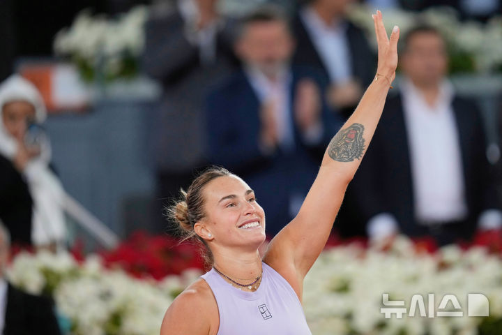 [마드리드=AP/뉴시스] 아리나 사발렌카(1위·벨라루스)가 29일(현지 시간) 스페인 마드리드에서 열린 여자프로테니스(WTA) 마드리드오픈(WTA1000) 16강전에서 페이튼 스턴스(44위·미국)를 꺾은 후 팬들에게 인사하고 있다. 사발렌카가 2-0(6-2 6-4)으로 이기고 8강에 올랐다 2025.04.30.