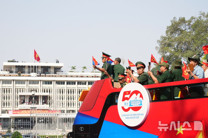 [호찌민=AP/뉴시스] 30일(현지 시간) 베트남 호찌민에서 베트남 전쟁 종전 50주년 기념 퍼레이드가 열려 베트남 전쟁 참전 군인들이 무개 버스를 타고 독립궁(통일궁) 앞을 지나고 있다. 2025.04.30.