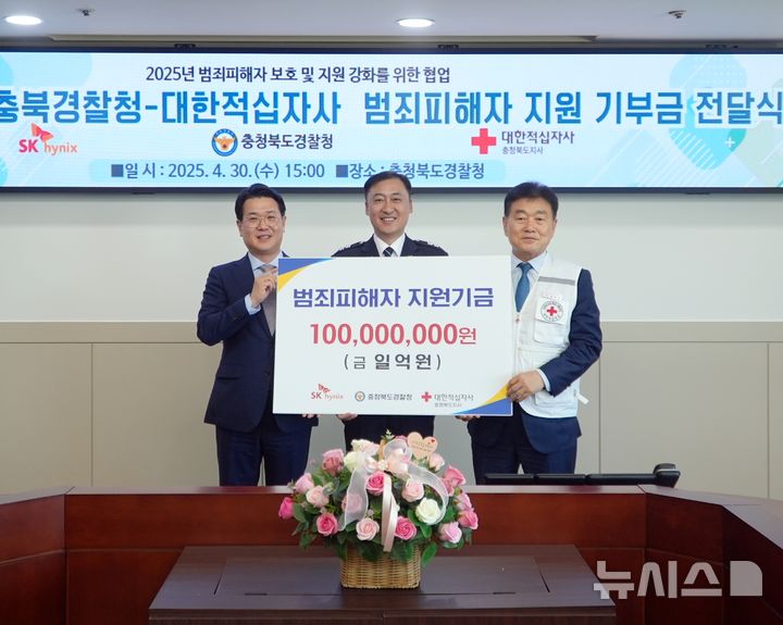 [청주=뉴시스] 30일 충북경찰청 소회의실에서 열린 'SK하이닉스 범죄피해자 사회공헌기금 전달식'에서 이일우(왼쪽 첫 번째) SK하이닉스 경영지원 부사장과 김학관(왼쪽 두 번째) 충북경찰청장, 장헌봉(왼쪽 세 번째) 대한적십자사 충북지사 회장이 기념촬영을 하고 있다. (사진=충북경찰청 제공) 2025.04.30. [email protected]