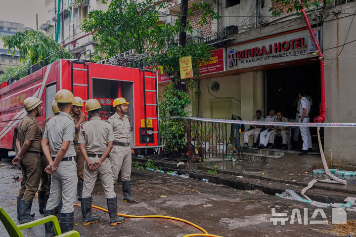 [콜카타=AP/뉴시스] 30일(현지 시간) 인도 서벵골주 콜카타에서 소방관들이 화재가 발생했던 호텔 주변에 모여 있다. 현지 경찰은 전날 밤 콜카타 시내 리투라지 호텔에서 화재가 발생해 최소 15명이 숨졌으며 화재 원인은 조사 중이라고 밝혔다. 2025.04.30.