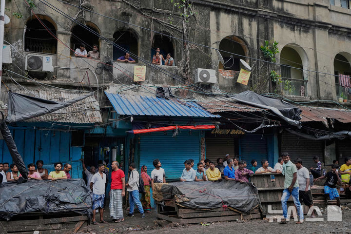 [콜카타=AP/뉴시스] 30일(현지 시간) 인도 서벵골주 콜카타 주민들이 전날 화재가 발생했던 호텔 주변에 모여 있다. 현지 경찰은 전날 밤 콜카타 시내 리투라지 호텔에서 화재가 발생해 최소 15명이 숨졌으며 화재 원인은 조사 중이라고 밝혔다. 2025.04.30.