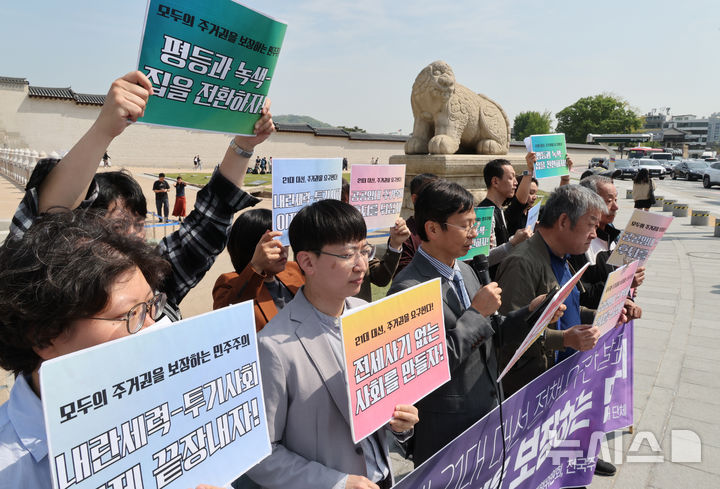 [서울=뉴시스] 김명원 기자 = 주거권네트워크·참여연대 등 회원들이 30일 오전 서울 종로구 광화문 월대앞에서 '21대 대선, 모두의 주거권이 보장되는 민주주의로 나아가자'며 '세입자 보호강화, 공공임대주택과 주거복지 확대' 등 대선 정책 요구안 발표 기자회견을 하고 있다. 2025.04.30. [email protected]