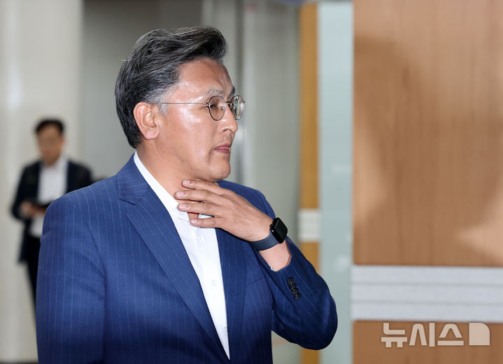 [서울=뉴시스] 이영환 기자 = 지역 개발사업을 명목으로 건축업자에게 금품을 받은 혐의로 구속영장이 청구된 박성만 경상북도의회 의장이 30일 오후 서울 서초구 서울중앙지방법원에서 열린 구속 전 피의자 심문(영장실짐심사)에 출석하고 있다. 2025.04.30. [email protected]
