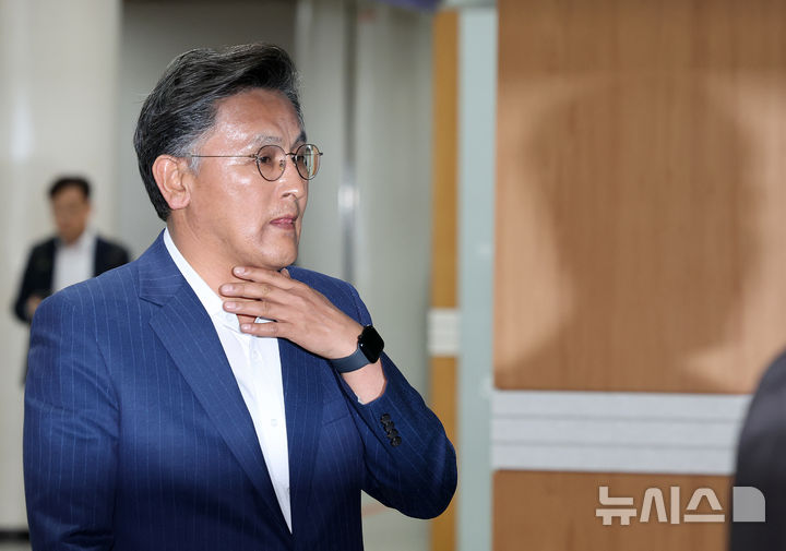 [서울=뉴시스] 이영환 기자 = 지역 개발사업을 명목으로 건축업자에게 금품을 받은 혐의로 구속영장이 청구된 박성만 경상북도의회 의장이 30일 오후 서울 서초구 서울중앙지방법원에서 열린 구속 전 피의자 심문(영장실짐심사)에 출석하고 있다. 2025.04.30. [email protected]